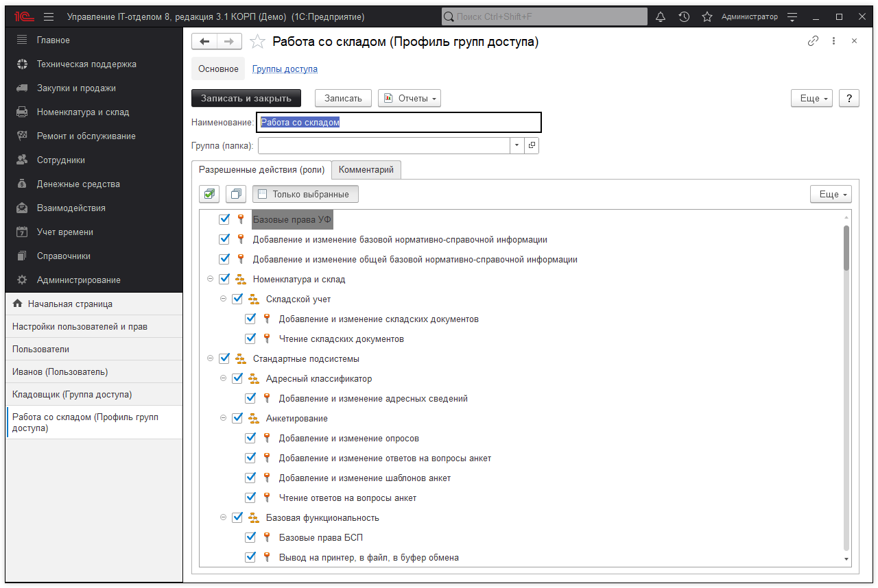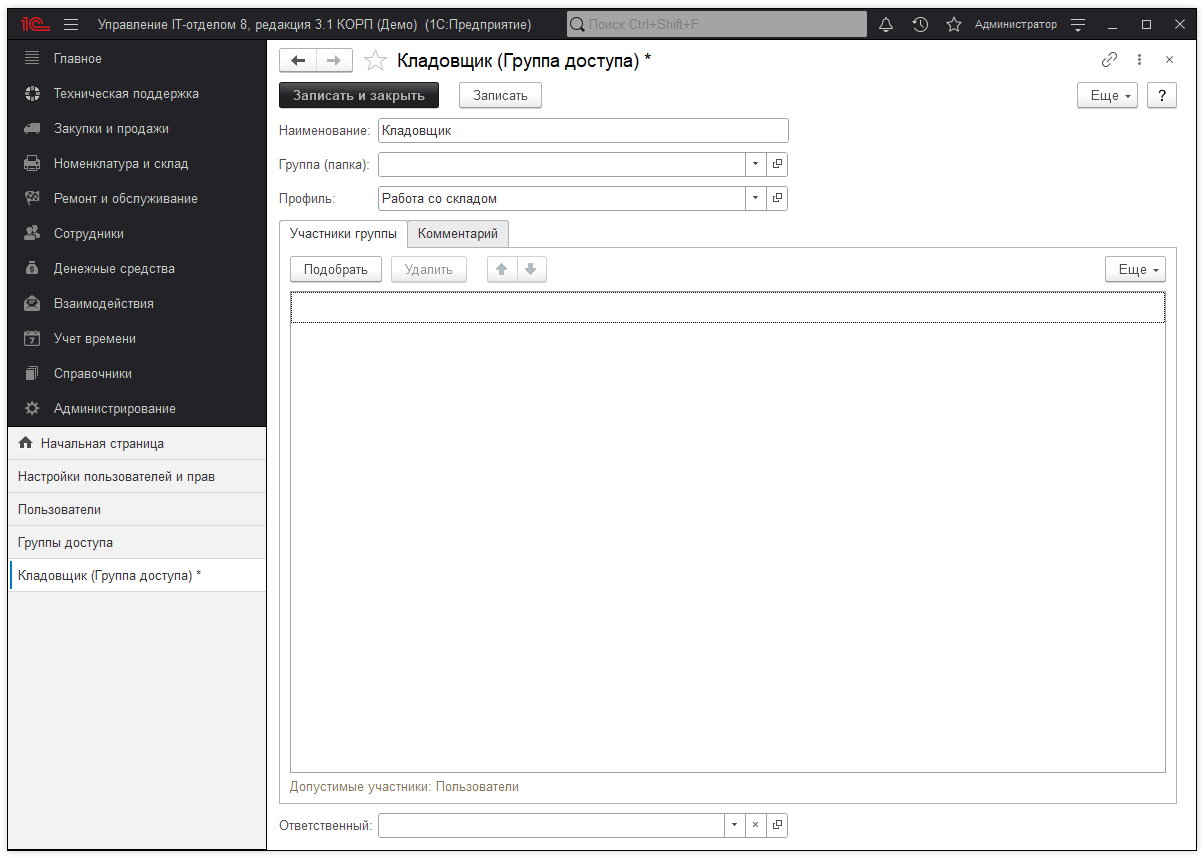 Создадим группу доступа "Кладовщики" и сохраним ее: