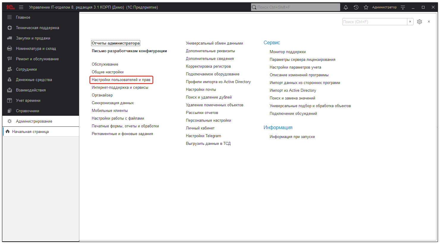Если пользоваться конфигурацией будете не только Вы, необходимо добавить дополнительных пользователей в конфигурацию. Конфигурация поддерживает импорт пользователей из Active Directory.