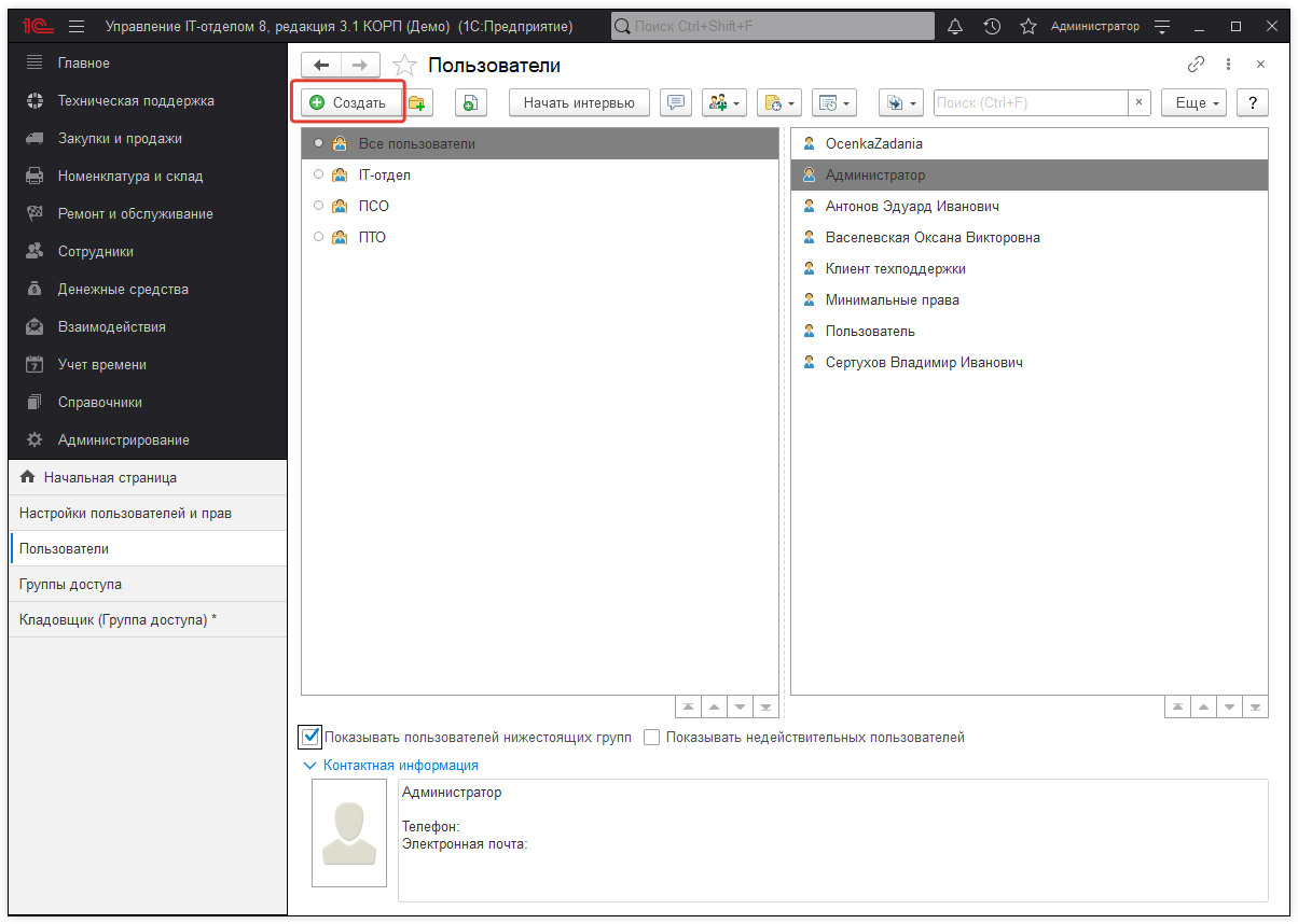 Перейдем к добавлению пользователями. Откроем справочник "Пользователи" и добавим нового: