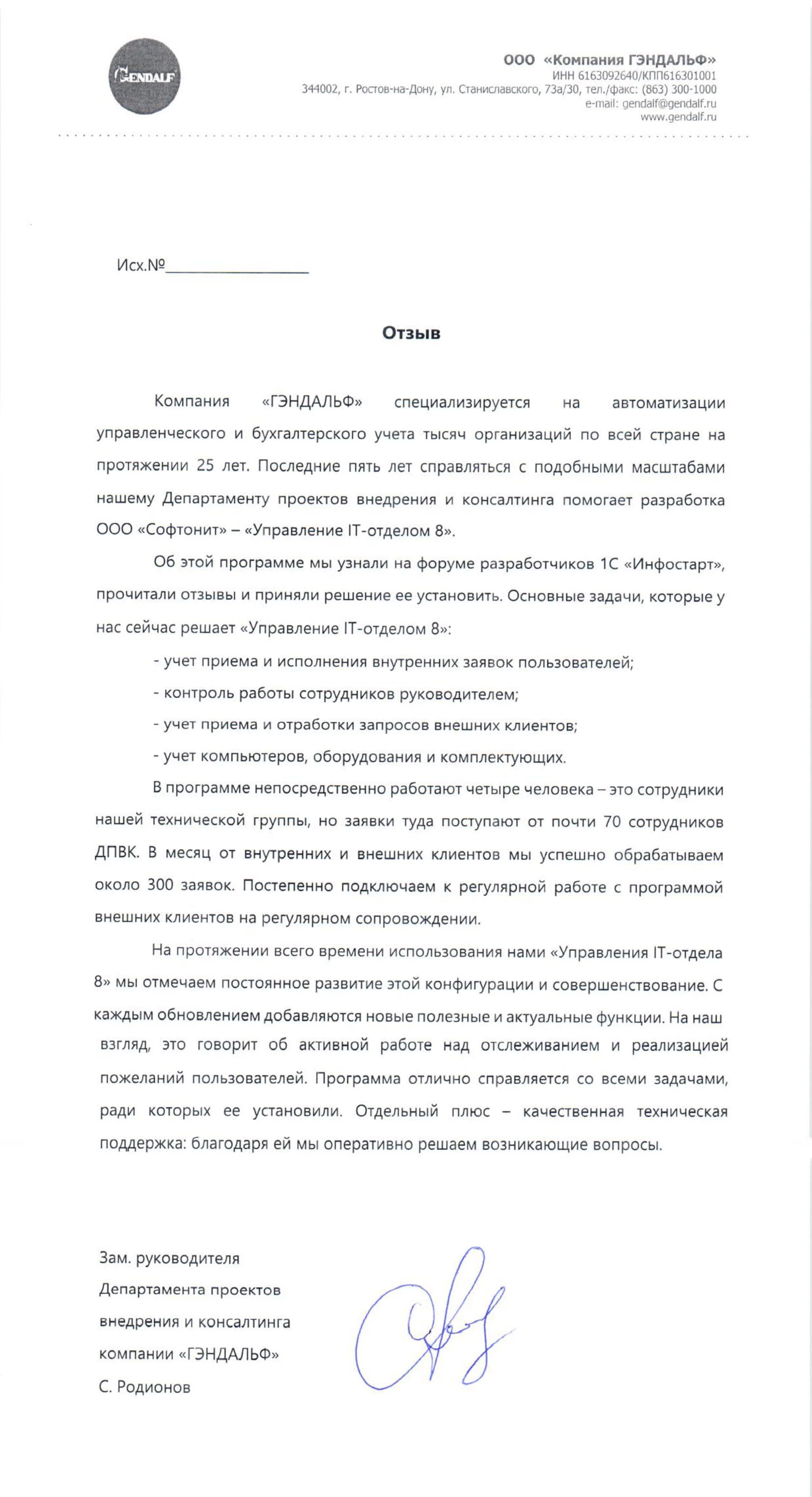 Отзыв на программу Управление IT-отделом 8. Родионов Сергей Викторович Зам. руководителя Департамента проектов внедрения и консалтинга компании «ГЭНДАЛЬФ» ООО «Компания «ГЭНДАЛЬФ»